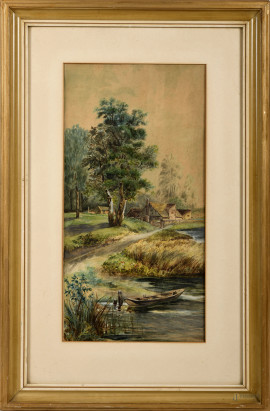 Scorcio di paesaggio fluviale, XIX-XX secolo, acquerello su carta, cm 75x45 compreso passepartout, entro cornice, (difetti)