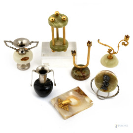 Lotto di 7 oggetti in marmo e metallo, altezza massima cm 10,5, (difetti, sbeccature)