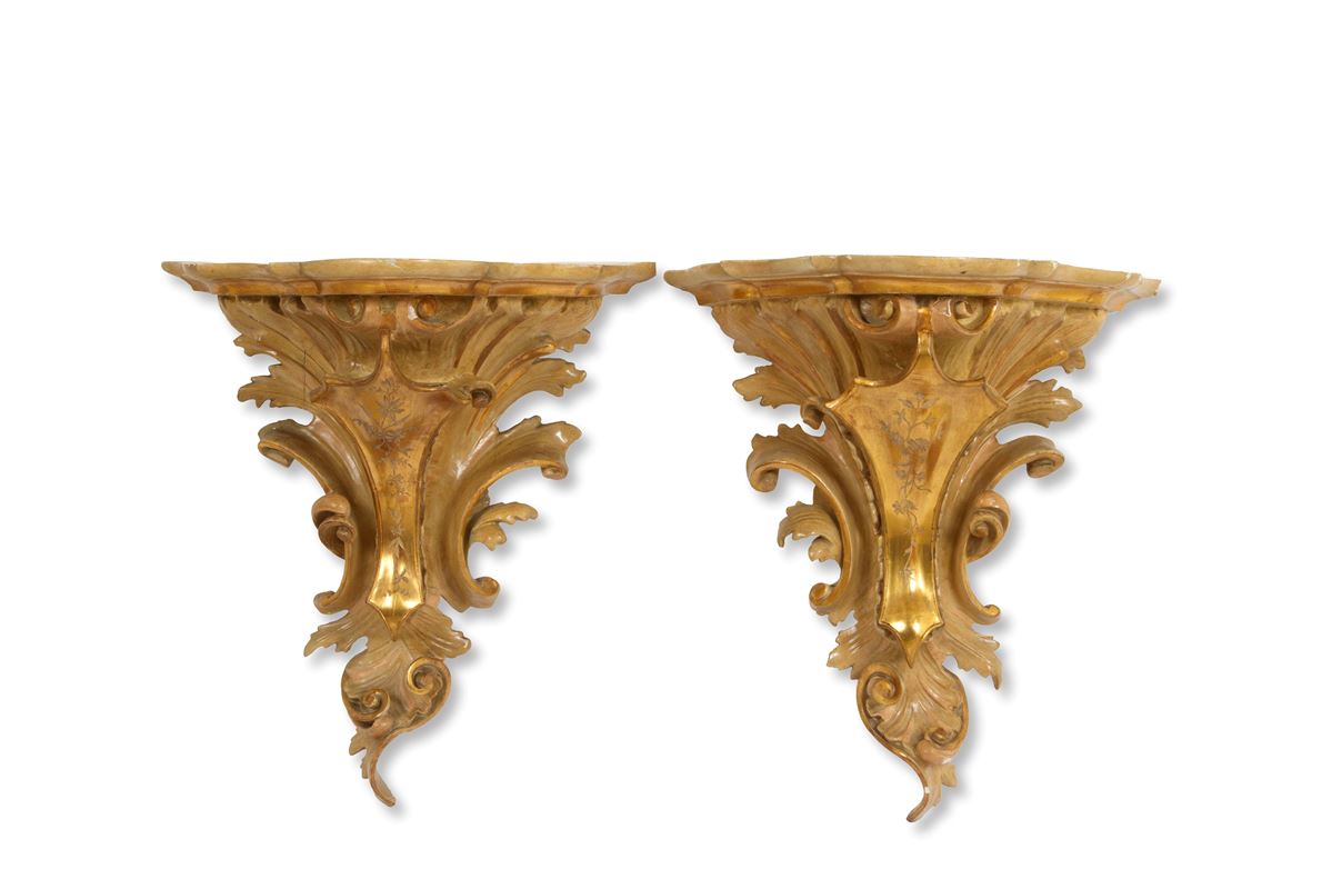 Coppia di mensole - Coppia di mensole in legno finemente intagliato, laccato e dorato. XIX secolo. - 53x50x31 cm ca. -
