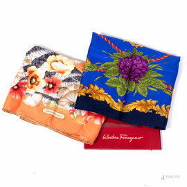 Lotto di due foulard Salvatore Ferragamo a motivi floreali, cm 86x86
