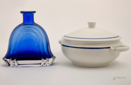 Lotto composto da una zuppiera in porcellana bianca e blu, Richard Ginori, e da una bottiglia in vetro nel toni del blu, misura max cm 15,5x30,5 (difetti)
