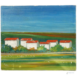 Paesaggio con case, olio su tela, XX secolo, cm 30x35 (difetti)