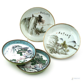 • Lot n° 0407 Lotto di due piattini in metallo dipinto e due piattini in porcellana smaltata, XX secolo, diametro massimo cm 14