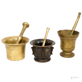 Lotto composto da 3 mortai in bronzo, XIX-XX secolo, misure massime, cm 10,5x11,5, (difetti)