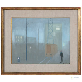Franco Villoresi (1920-1975), Interno di stazione, olio su tela, cm 40x50, firmato in basso a destra, firmato, titolato e datato "1953" al retro, entro cornice
