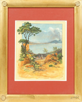 Stampa colorata su carta raffigurante il Golfo di Napoli, XIX-XX secolo, cm 39x30, entro cornice