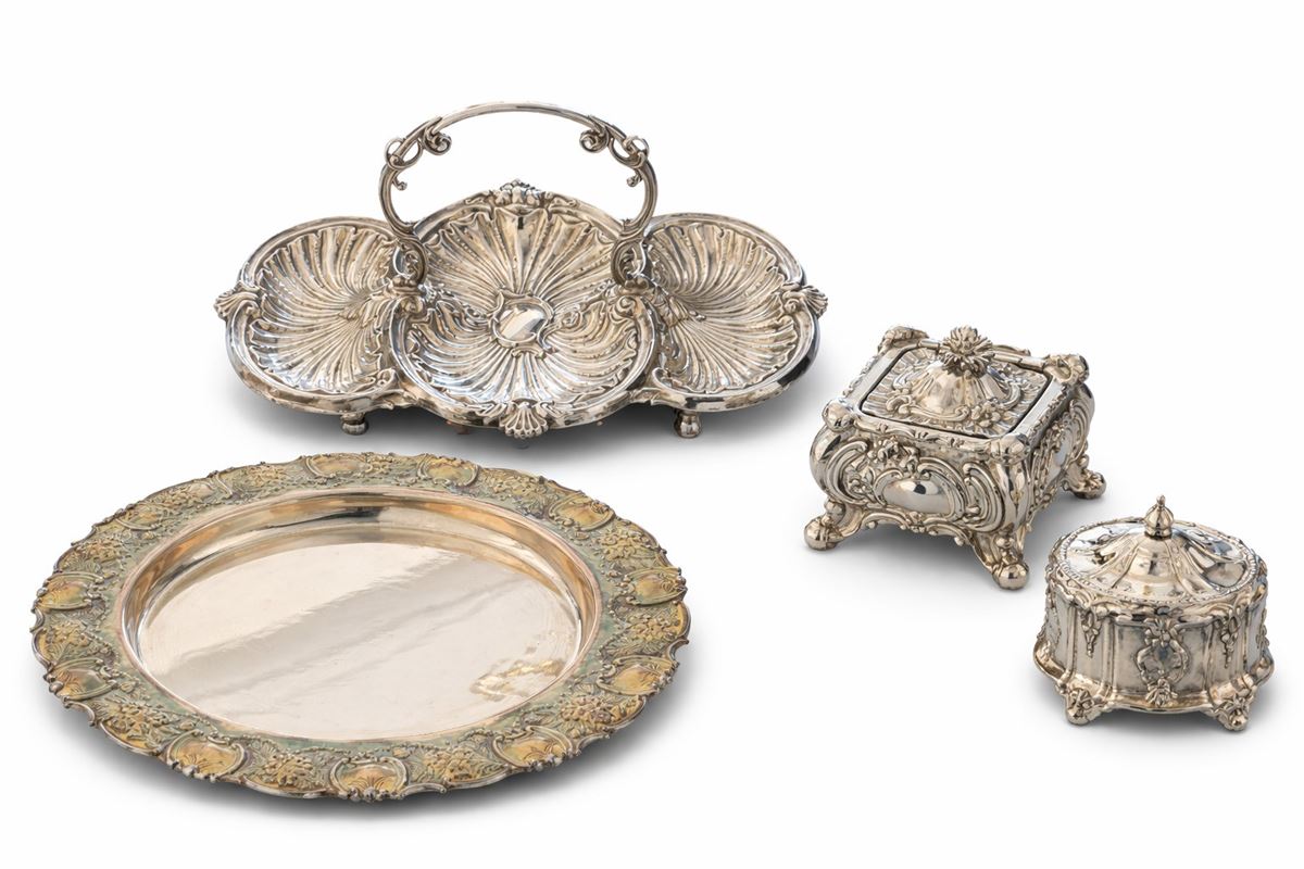 Lotto di oggetti da tavola in metallo argentato - Composto da: 2 zuccheriere (10 x 9 cm - 9 x 10 cm), 1 vassoio circolare (d. 30 cm), 1 antipastiera (33 x 24 cm).I lotti oggetto della presente asta sono ubicati presso un’abitazione privata sita in Roma.La partecipazione all’asta implica la piena accettazione della condizione secondo cui il ritiro dei beni aggiudicati sarà interamente a cura, rischio e spese dell’aggiudicatario.Resta inteso che eventuali operazioni di smontaggio, imballaggio, trasporto e ritiro dovranno essere organizzate direttamente dall’aggiudicatario.Si raccomanda pertanto di richiedere preventivamente tutte le informazioni necessarie, anche al fine di acquisire eventuali preventivi per il trasporto prima di formulare un’offerta. - -