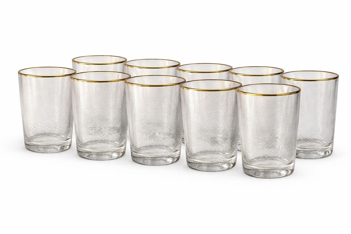 Serie di otto bicchieri in vetro inciso con bordo dorato - Bicchieri di forma cilindrica leggermente svasata, realizzati in vetro trasparente con decorazione incisa a motivo geometrico continuo su tutta la superficie. Il bordo superiore è rifinito con filetto dorato, che conferisce un tono elegante all’insieme.I lotti oggetto della presente asta sono ubicati presso un’abitazione privata sita in Roma.La partecipazione all’asta implica la piena accettazione della condizione secondo cui il ritiro dei beni aggiudicati sarà interamente a cura, rischio e spese dell’aggiudicatario.Resta inteso che eventuali operazioni di smontaggio, imballaggio, trasporto e ritiro dovranno essere organizzate direttamente dall’aggiudicatario.Si raccomanda pertanto di richiedere preventivamente tutte le informazioni necessarie, anche al fine di acquisire eventuali preventivi per il trasporto prima di formulare un’offerta. - 11 x 7 cm -
