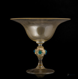 Alzata in vetro di Murano Nason con elementi floreali in rilievo , XX secolo, altezza cm 24,5, (lievi segni di usura)
