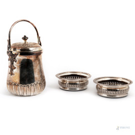 • Lot n° 0064 Portaghiaccio e due sottobottiglia in metallo argentato, XX secolo, misure massima cm 23x16 (segni di usura)