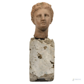 Testa virile in terracotta su base in pietra, XX secolo, altezza cm 82, (difetti, sbeccature, scalfiture)