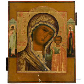 Icona raffigurante Madonna con Bambino, XIX secolo, cm 17x14, (scalfiture, cadute di colore)