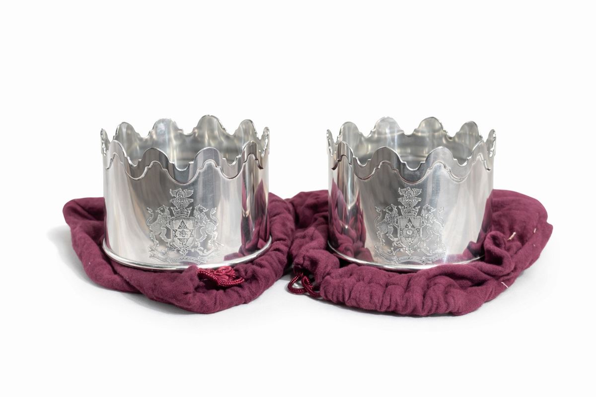 • Lot n° 0313 Brandani - Coppia di sottobottiglie - con decorazione incisa con stemma e leoni. Metallo argentato e base interna in legno. - 8 x 10,5 cm -