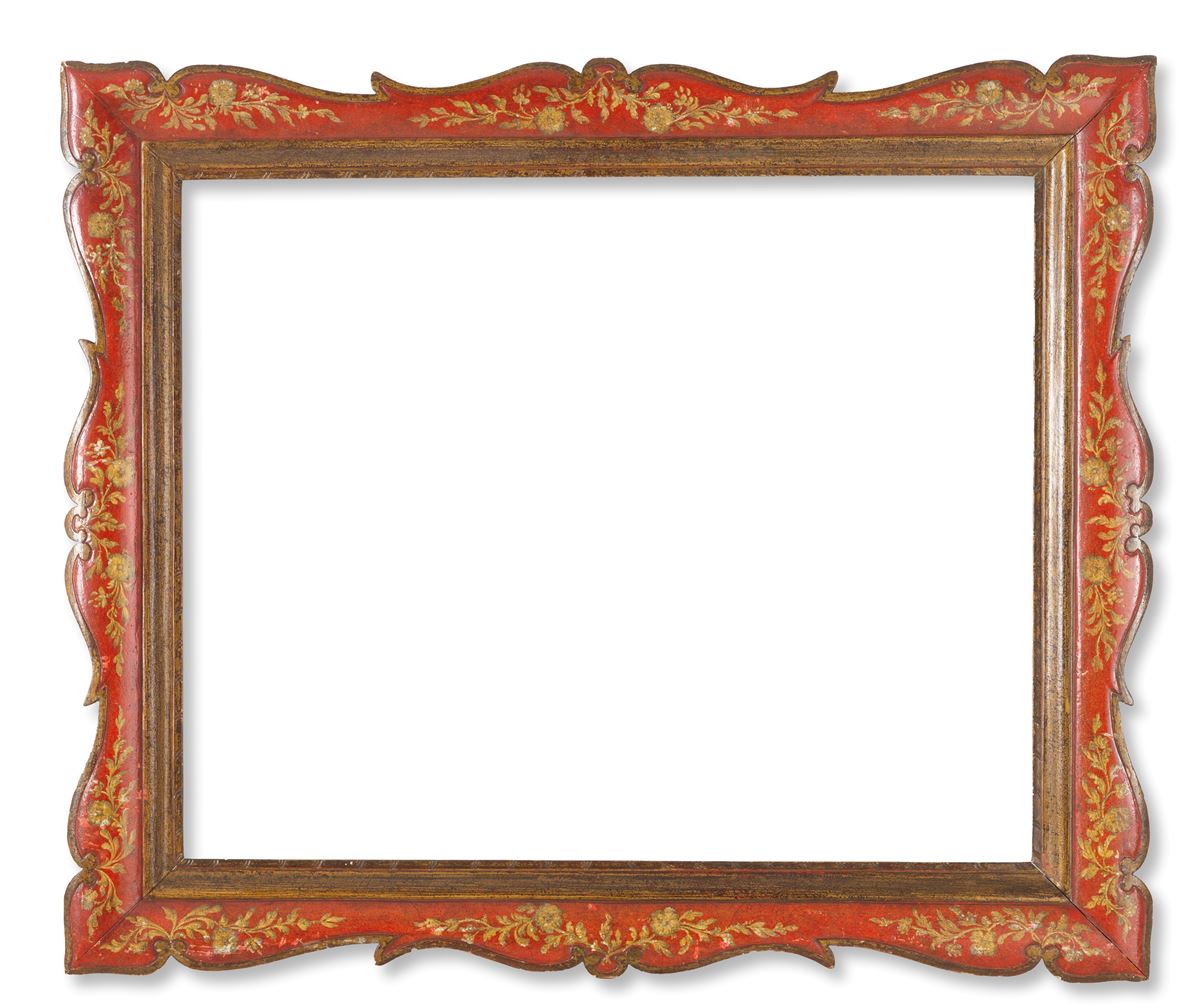 Cornice in legno - Cornice in legno laccato rosso decorato con motivi floreali. XX secolo. Lievi difetti. - 106x90 cm ca. -