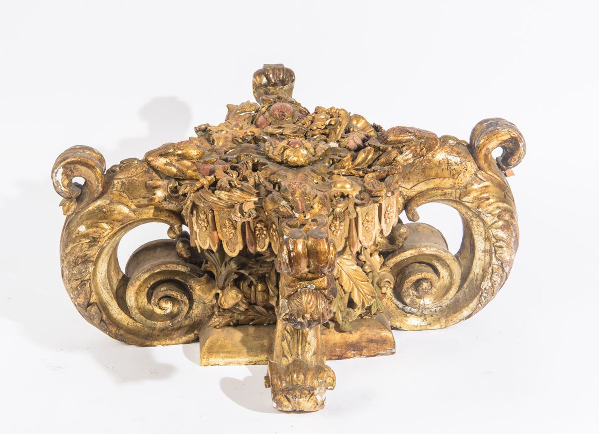 Importante base - Importante base in legno intagliato e finemente dorato a oro zecchino.La struttura, di forte impianto plastico e scenografico, è caratterizzata da ampie volute laterali contrapposte, riccamente modellate, che sostengono un elaborato corpo centrale decorato con motivi vegetali, foglie d’acanto, elementi fitomorfi e pendoni intagliati. Il fronte è arricchito da un elemento aggettante scolpito.La qualità dell’intaglio, la ricchezza ornamentale e la doratura a oro zecchino rimandano alla produzione di fine età Luigi XIV, destinata ad arredi di rappresentanza. - 50 X 95 cm -