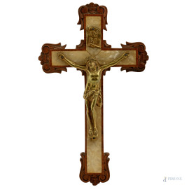 Crocifisso in bronzo dorato e legno, XX secolo, cm 32x29