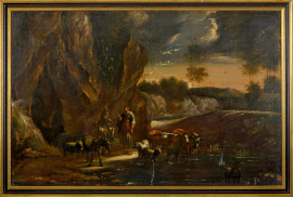 Paesaggio con figure e armenti, olio su tela, XVIII secolo, cm 70x108 entro cornice, (difetti)
