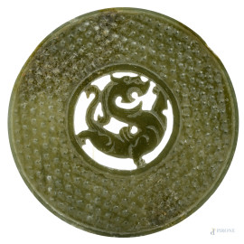 Placca in giadeite traforata con dragone centrale, XX secolo, diametro cm10,5 , (scalfiture, segni di usura)