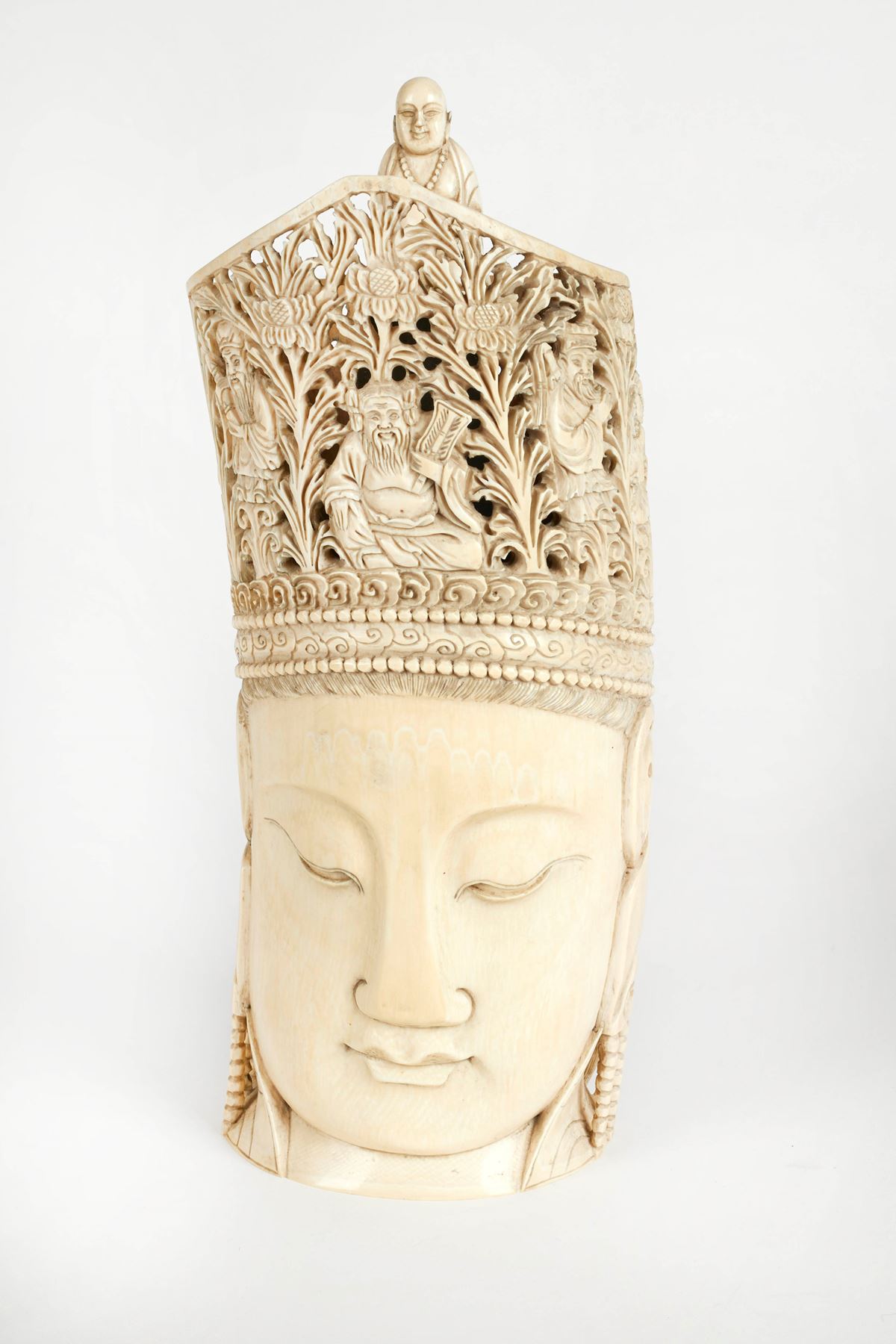 Scultura in avorio - Scultura in avorio di elefante raffigurante Guanyin sormontata da una piccola statuta di Buddha. Cina, fine del XIX secolo. Cm 33,5×13×12. Corredata di certificazione CITES. - Cm 33,5×13×12 -