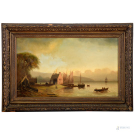 • Lot n° 0222 Scorcio di marina olandese, XIX secolo, olio su tela, siglato GB in basso a destra, cm 45x75,5 entro cornice (ondulazioni della tela, lieve craquelure)