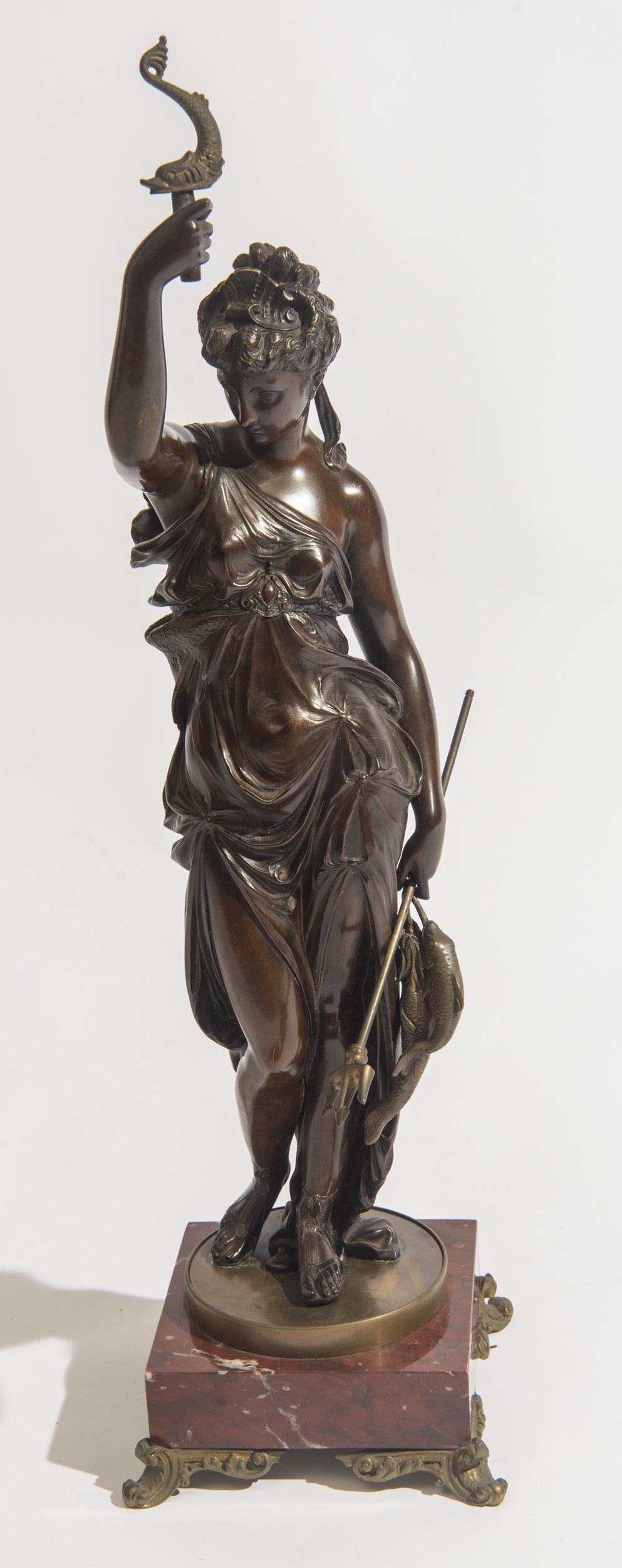 Scultura raffigurante allegoria della pesca - In bronzo brunito, con sostituzioni. - H. 64 x 15 x 15 cm - bronzo