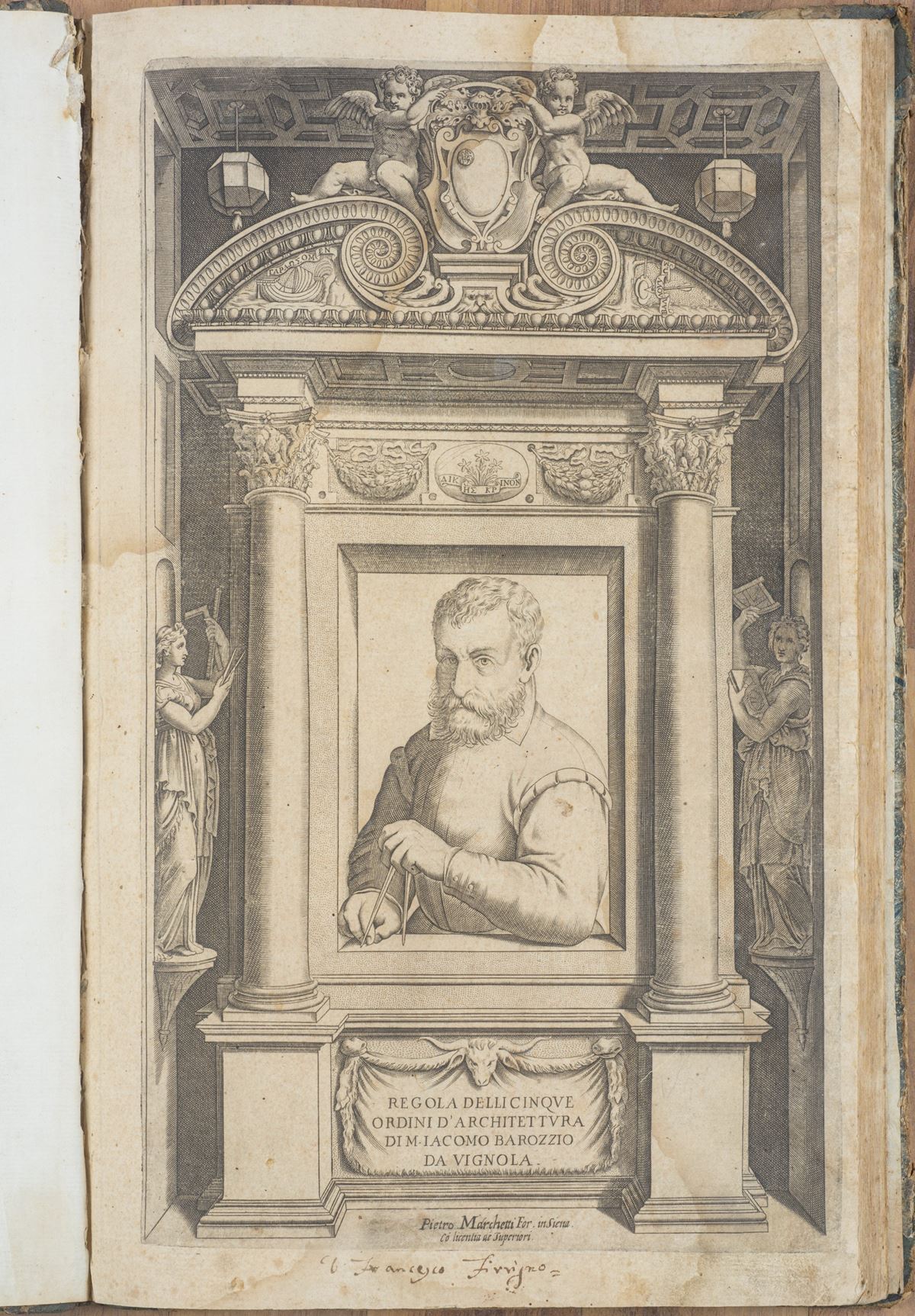 • Lot n° 0043 Regola de li cinque ordini d'architettura - Sotto il ritratto dell'autore è visibile la dicitura "Piero Marchetti For. in Siena". Parte prima, due frontespizi con la tavola con dedica a Volunio Bandinelli e la prefazione. Contenente 37 tavole , relative ai cinque ordini, alle porte e a un camino. Restauri per strappi, aloni e fioriture. Legatura successiva. - 388 x 224 mm -