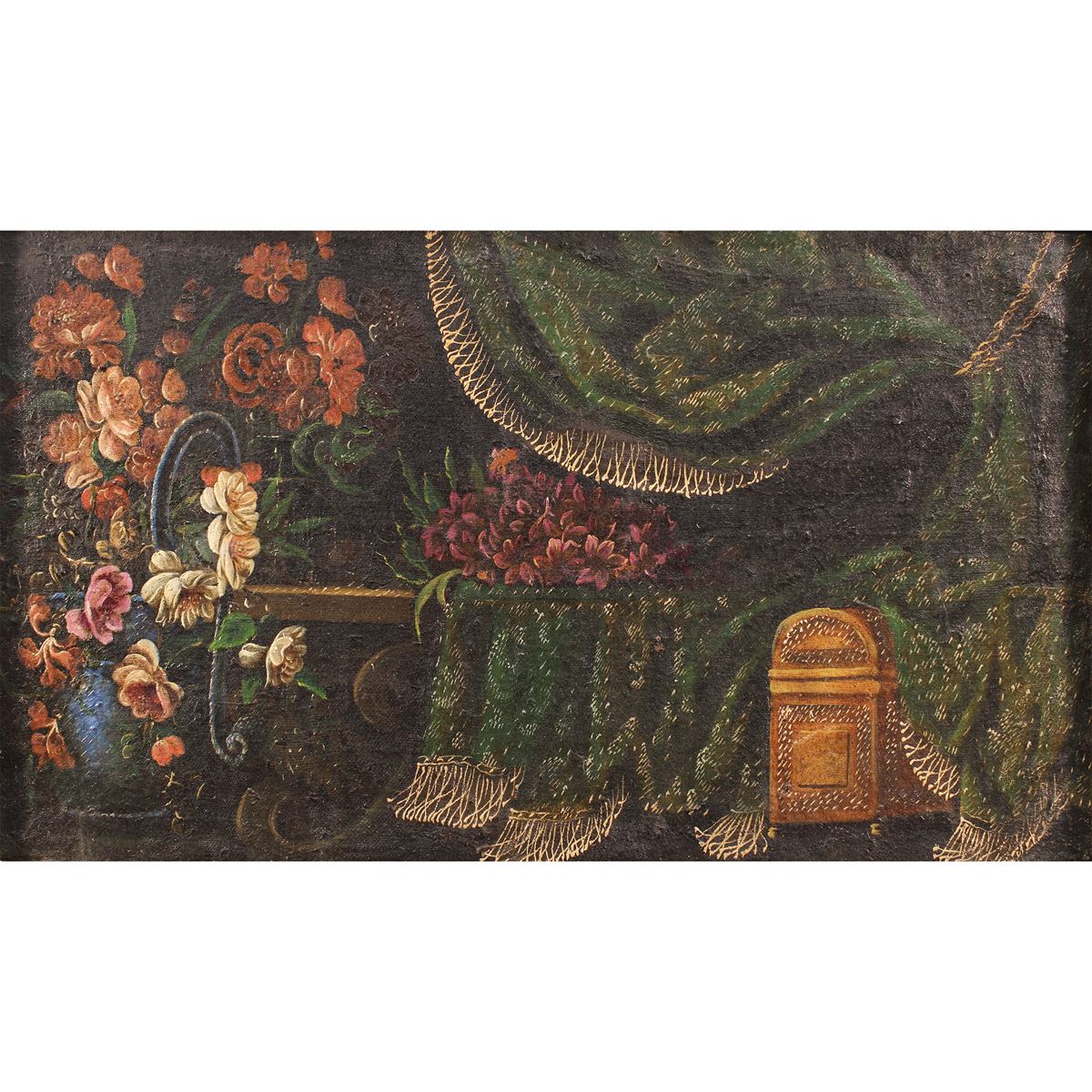 • Lot n° 0013 Scuola italiana - "Natura morta di fiori con tendaggio verde", olio su tela, entro cornice - 62x104 cm. -