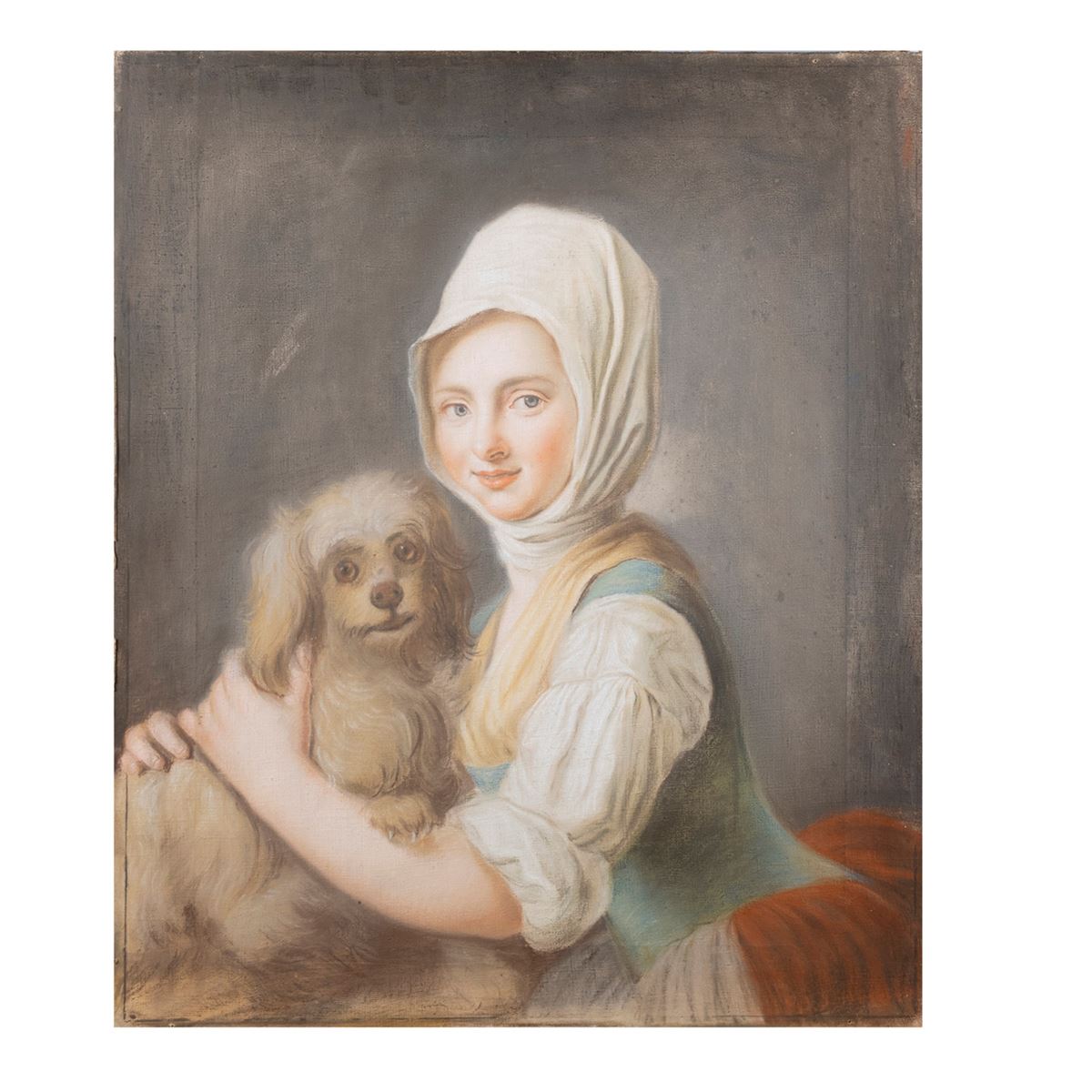 Scuola Francese - "Giovane contadina con cagnolino", pastello su tela, entro cornice - 73x61 cm. -