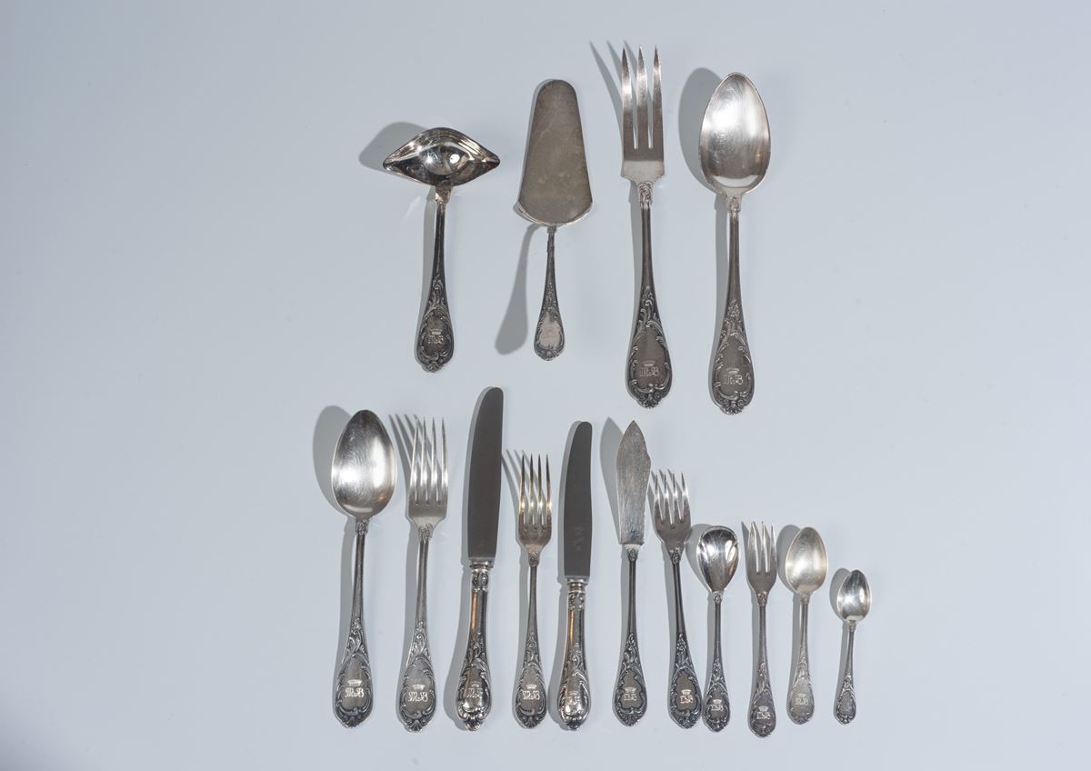 Servizio di posate in argento - Peso complessivo: 4316 gr. Composto da: 8 coltelli da pesce, 8 forchette da pesce, 6 forchettine, 7 cucchiai da gelato, 2 posate da servizio, 10 forchette grandi, 7 forchette medie, 8 cucchiai grandi, 10 coltelli grandi, 8 coltelli piccoli, 1 paletta, 12 cucchiaini, 1 mestolo, 6 forchette da dolce, 7 cucchiaini da caffè e 5 cucchiaini da thè. I lotti oggetto della presente asta sono ubicati presso un’abitazione privata sita in Roma.La partecipazione all’asta implica la piena accettazione della condizione secondo cui il ritiro dei beni aggiudicati sarà interamente a cura, rischio e spese dell’aggiudicatario.Resta inteso che eventuali operazioni di smontaggio, imballaggio, trasporto e ritiro dovranno essere organizzate direttamente dall’aggiudicatario.Si raccomanda pertanto di richiedere preventivamente tutte le informazioni necessarie, anche al fine di acquisire eventuali preventivi per il trasporto prima di formulare un’offerta. - -