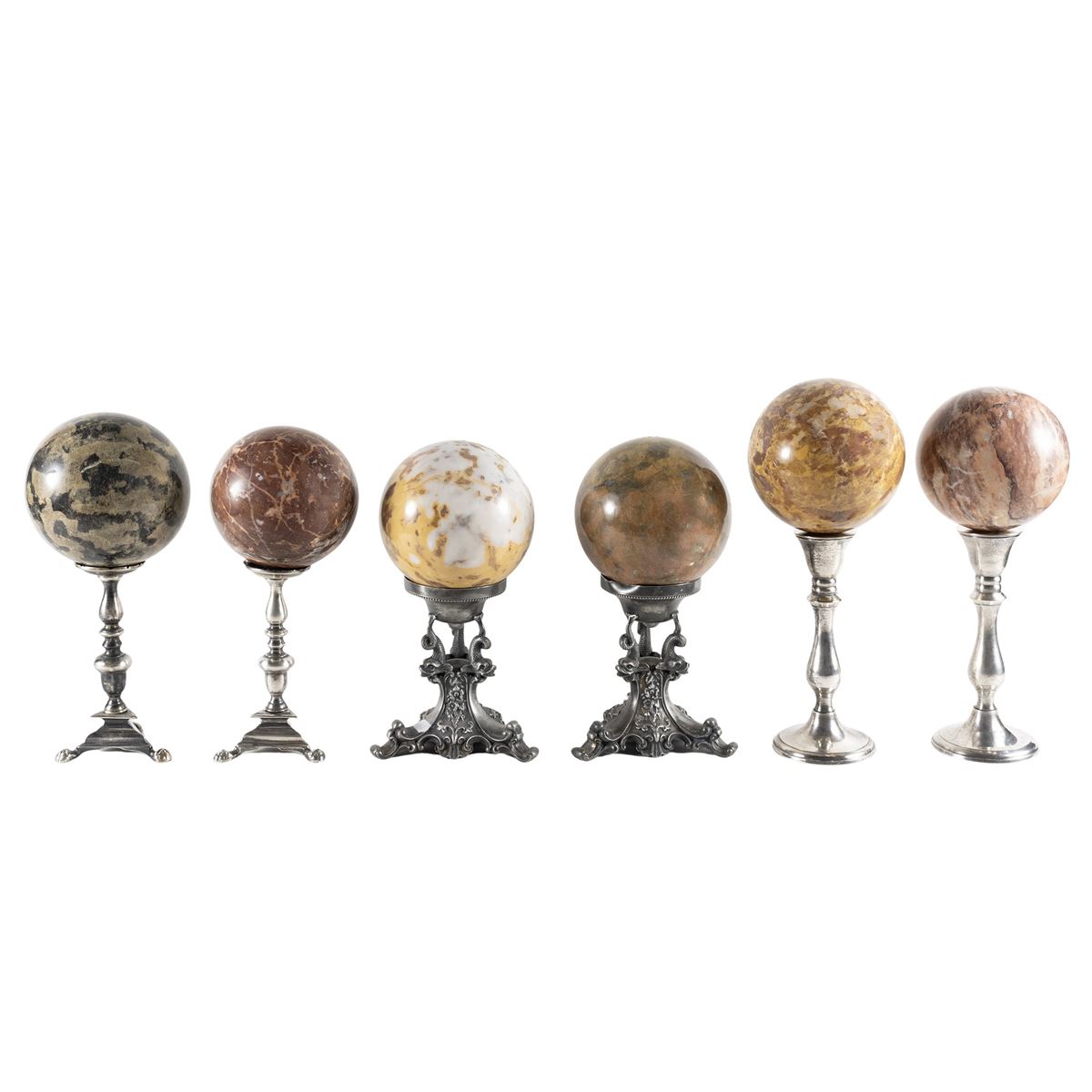 Gruppo di sei sfere in marmi diversi - poggianti su basi in metallo argentato di fogge e misure diverse - misure massime d. 14 cm. - h. 31,5 cm. -