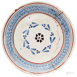 Grande piatto in maiolica policroma, XIX-XX secolo, diametro cm 43 (difetti)