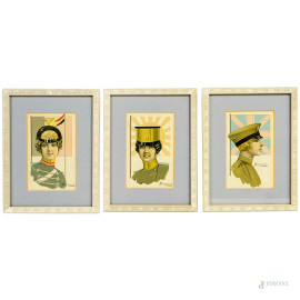 Lotto di tre cartoline di M. Cherubini raffiguranti donne in uniforme, misure comprese passepartout cm 18,5x14, entro cornici