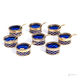 Otto salierine in argento e vetro cobalto, cm 2,5x3,5x2,5, peso gr 110 (cucchiaini in ag 800/000, strutture in ag 925/000)