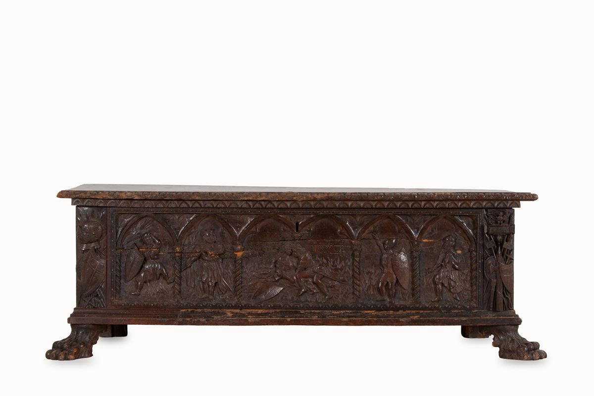 Cassapanca. Italia centrale - Cassapanca in legno con frontale intagliato con scene di poemi cavallereschi e piedi leonini. Italia centrale. XVII secolo. Difetti. - 58x168x50 cm ca. -