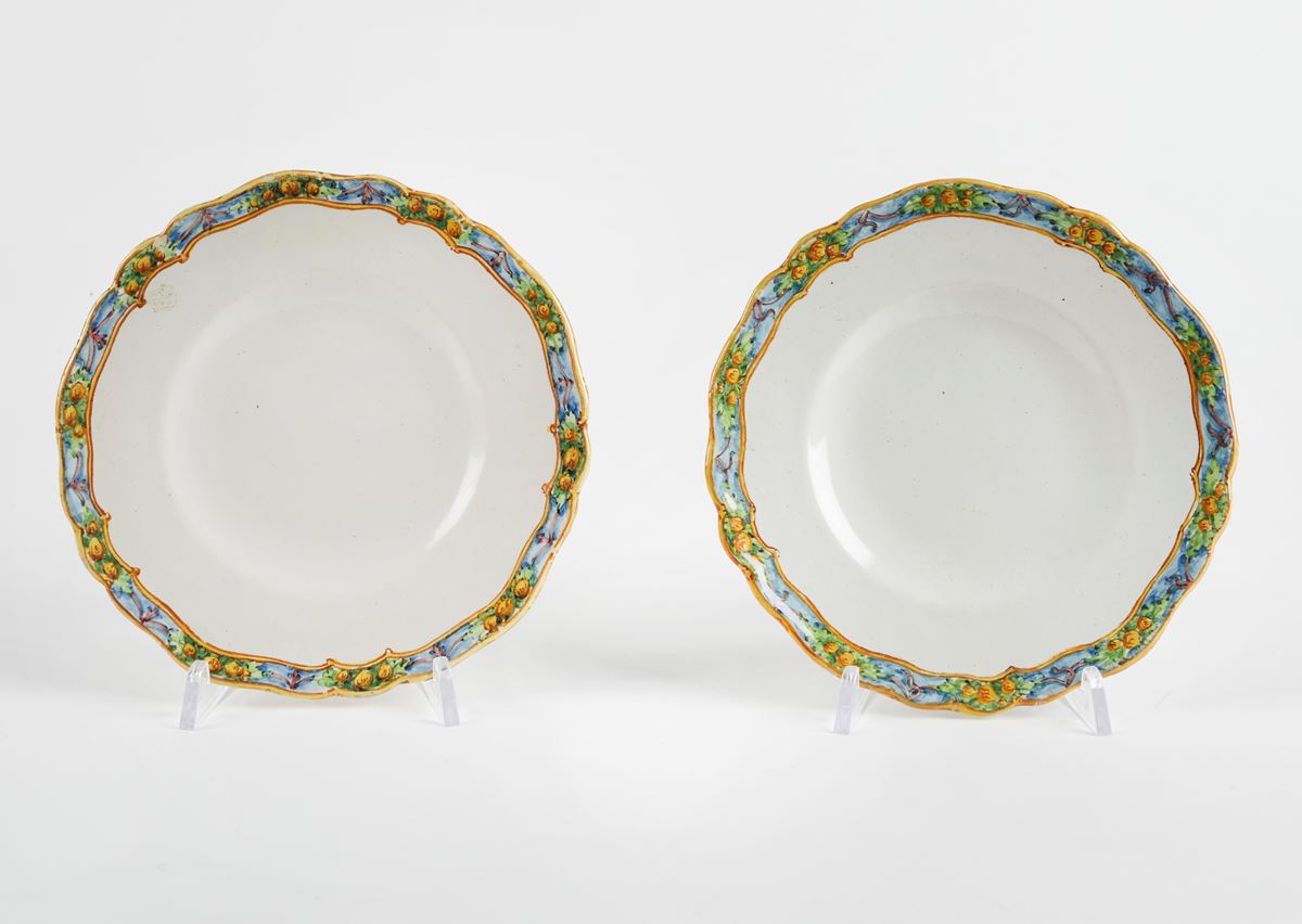 • Lot n° 0030 Coppia di piatti - MANIFATTURA MINGHETTI Coppia di piatti in ceramica policroma, decorati con ghirlande di frutta sul bordo. 1890 circa. Cm 2x16. Al retro recano marchio AM. (lievi difetti) Accompagnati da certificato di autenticità di Bottegantica, Bologna. - Cm 2x16 -