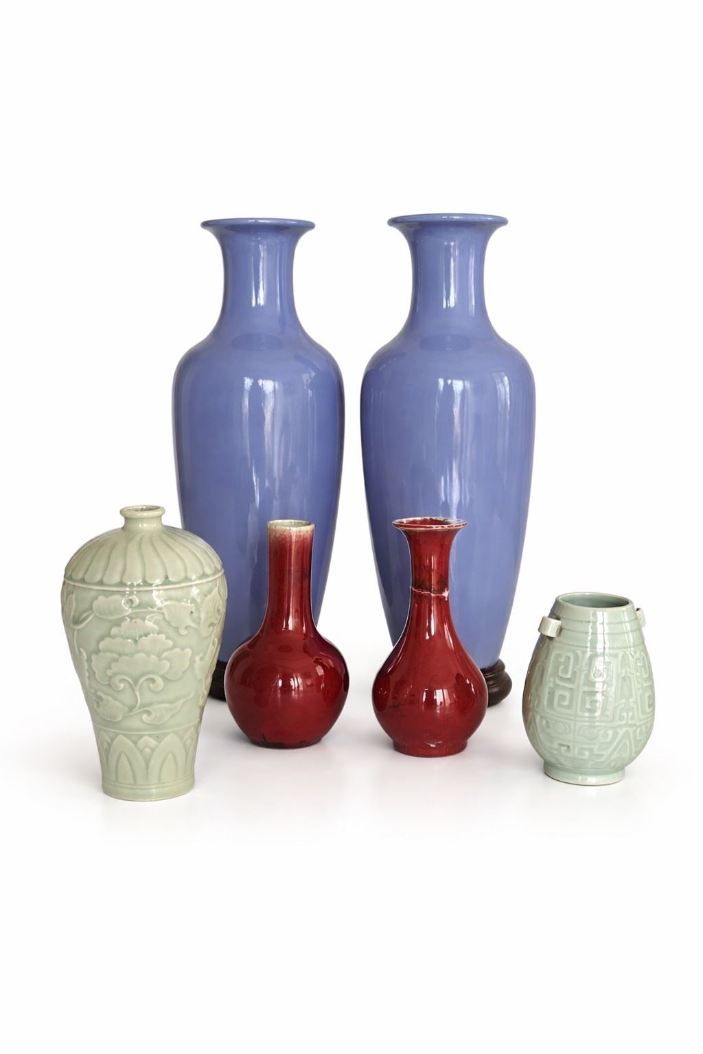 Lotto di sei Lotto di vasi in porcellana e ceramica - Il lotto comprende:coppia di grandi vasi a balaustro in porcellana invetriata color lavanda/azzurro uniforme, di gusto monocromo, su basi in legno;due piccoli vasi in porcellana a smalto rosso (tipo sang-de-boeuf), con corpo globulare e collo svasato;vaso con coperchio in ceramica celadon, decorato a rilievo con motivi floreali stilizzati;piccolo vaso in grès smaltato verde con decorazione geometrica incisa. Coppia di vasi (h. 43 cm), due vasi turchesi (h. 20 cm), due vasi rossi (h. 14 cm). Un vaso presenta una rottura al collo. Difetti.I lotti oggetto della presente asta sono ubicati presso un’abitazione privata sita in Roma.La partecipazione all’asta implica la piena accettazione della condizione secondo cui il ritiro dei beni aggiudicati sarà interamente a cura, rischio e spese dell’aggiudicatario.Resta inteso che eventuali operazioni di smontaggio, imballaggio, trasporto e ritiro dovranno essere organizzate direttamente dall’aggiudicatario.Si raccomanda pertanto di richiedere preventivamente tutte le informazioni necessarie, anche al fine di acquisire eventuali preventivi per il trasporto prima di formulare un’offerta. - -
