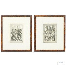 Lotto di due stampe raffigutanti episodi dell'Orlando Furioso, riproduzioni del XX secolo, misure max cm 17x12,5, entro cornici