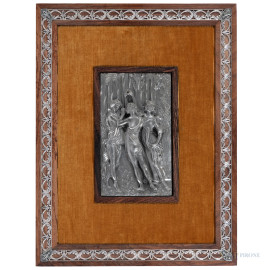Rilievo in metallo argentato raffigurante le tre Grazie, XX secolo, cm 17x10, firmato in basso a destra "Trezza", entro cornice