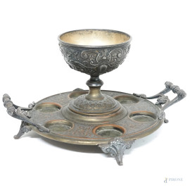 • Lot n° 0890 Alzatina in metallo a foggia di coppa su vassoio circolare, decori cesellati a motivi vegetali, poggiante su 4 piedini, XX secolo, cm 12,5x23x20,5 (difetti, mancanze)