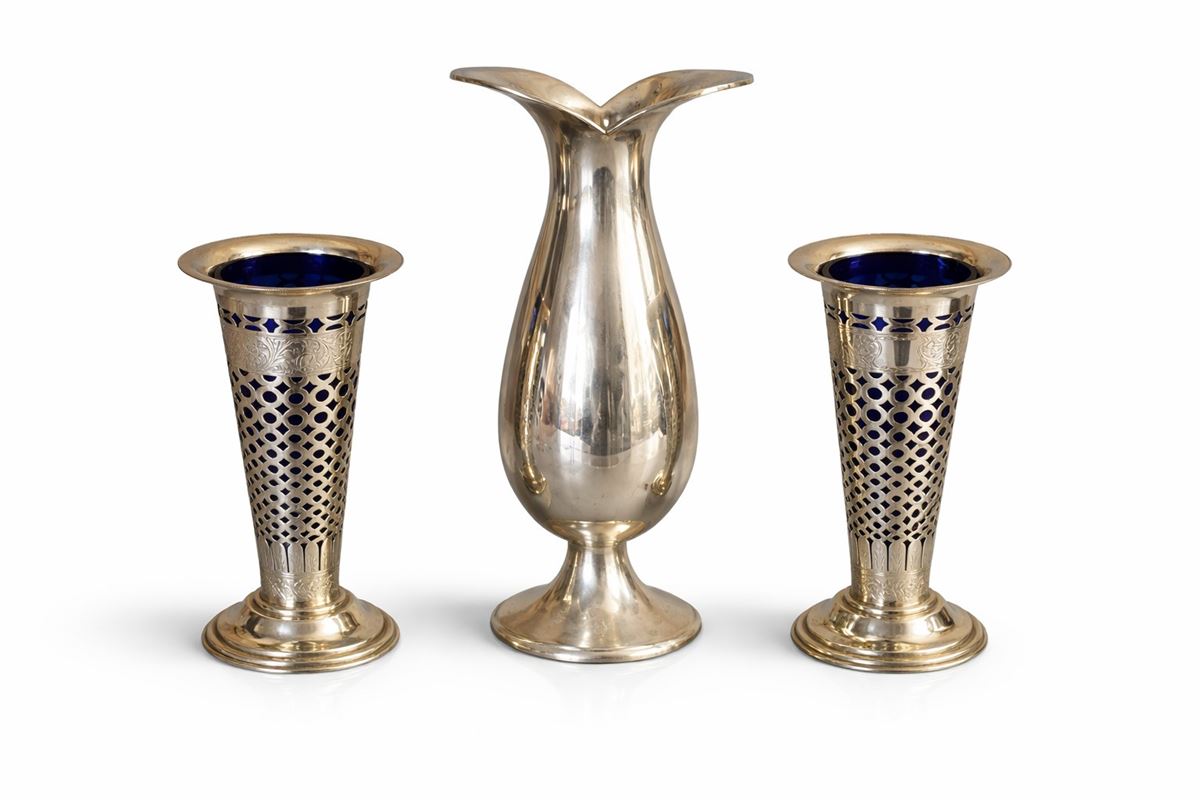 • Lot n° 0042 Tre vasi portafiori in argento - una coppia di vasi con opalina blu (110 gr. ciascuno)(h. 18 cm), 1 vaso (370 gr. ciascuno)( h. 25 cm). I lotti oggetto della presente asta sono ubicati presso un’abitazione privata sita in Roma.La partecipazione all’asta implica la piena accettazione della condizione secondo cui il ritiro dei beni aggiudicati sarà interamente a cura, rischio e spese dell’aggiudicatario.Resta inteso che eventuali operazioni di smontaggio, imballaggio, trasporto e ritiro dovranno essere organizzate direttamente dall’aggiudicatario.Si raccomanda pertanto di richiedere preventivamente tutte le informazioni necessarie, anche al fine di acquisire eventuali preventivi per il trasporto prima di formulare un’offerta. - -