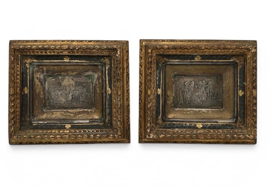 Coppia di placche - Coppia di placche in argento entro cornice coeva in legno dorato. XIX secolo, Fiandre. Intitolate in basso "Avant Le Mariage" e "Kermesse Flamande" (quest'ultima copia da David Teniers Il Giovane). Cadauna cm 10x14. - Cadauna cm 10x14 -
