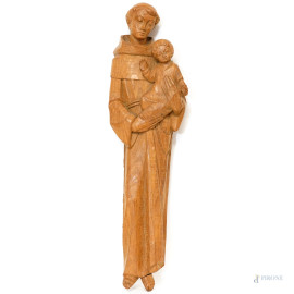 Flavio Pancheri (attivo a Ortisei, 1962 - 1994), Scultura in legno raffigurante San Francesco con il Bambino, altezza cm 75
