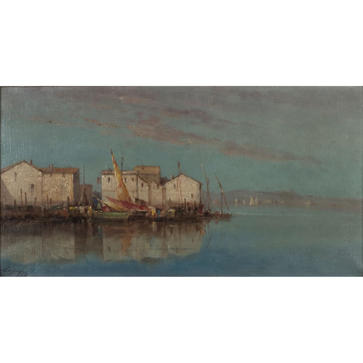 Pittore dell'Italia settentrionale - "Marina veneta", olio su tela, firmato in basso a sinistra, entro cornice - 22x41 cm. -