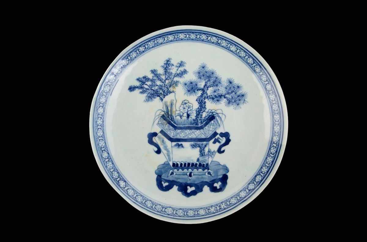 Piatto bianco e blu - Piatto in porcellana bianca e blu con vaso con piante al centro. Cina. XIX secolo. Lieve sbeccatura. - Diam. 20 cm ca. -