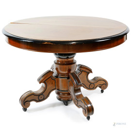 • Lot n° 0100 Lotto composto da tavolo ovale apribile, in noce con rifinitura perimetrale laccata nero e fusto terminante in quattro piedi mossi (cm 73,5x110x98), e da 4 sedie in noce con rifiniture laccate nero, con schienali intagliati e sedute rivestite in tessuto a fiorato (cm 88x42x39), XX secolo, (difetti, rotture)