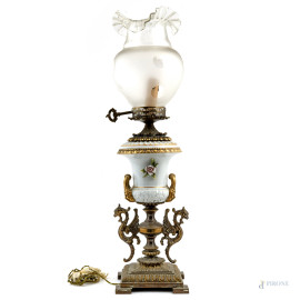 Lampada con struttura in metallo cesellato a dragoni e struttura in porcellana dipinta e dorata, XX secolo, altezza cm 60, (segni di usura, difetti)