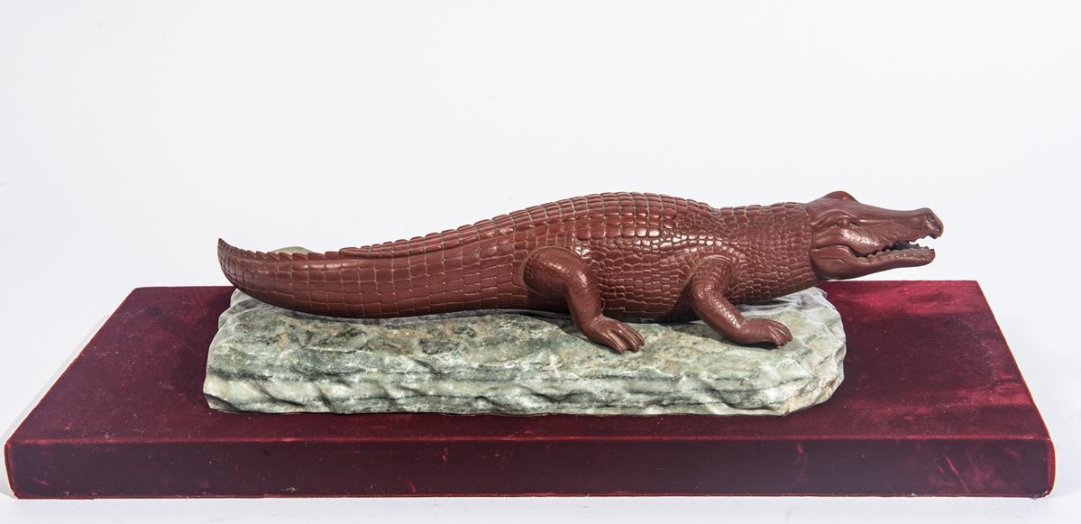 Coccodrillo in marmo rosso antico - Scultura decorativa raffigurante un coccodrillo naturalisticamente modellato, poggiante su basamento rettangolare in marmo verde a rocaille. La scultura è presentata su base rettangolare rivestita in velluto rosso. - 50 x 20 cm -