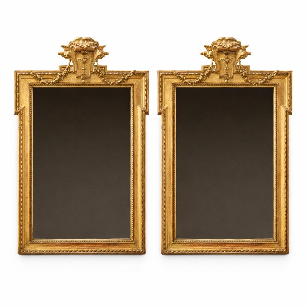Coppia di specchiere in legno dorato in stile Luigi XVI - Coppia di specchiere in legno intagliato e dorato, caratterizzate da linee rigorose e proporzionate, tipiche del gusto Luigi XVI. Le cornici presentano un profilo rettilineo arricchito da modanature con motivi a perline e intrecci, che incorniciano specchi di forma rettangolare.La parte superiore è sormontata da un elemento decorativo scolpito a motivo di vaso con festoni e nastri, chiaro richiamo al repertorio ornamentale neoclassicoI lotti oggetto della presente asta sono ubicati presso un’abitazione privata sita in Roma.La partecipazione all’asta implica la piena accettazione della condizione secondo cui il ritiro dei beni aggiudicati sarà interamente a cura, rischio e spese dell’aggiudicatario.Resta inteso che eventuali operazioni di smontaggio, imballaggio, trasporto e ritiro dovranno essere organizzate direttamente dall’aggiudicatario.Si raccomanda pertanto di richiedere preventivamente tutte le informazioni necessarie, anche al fine di acquisire eventuali preventivi per il trasporto prima di formulare un’offerta. - 40 x 35 cm - legno dorato