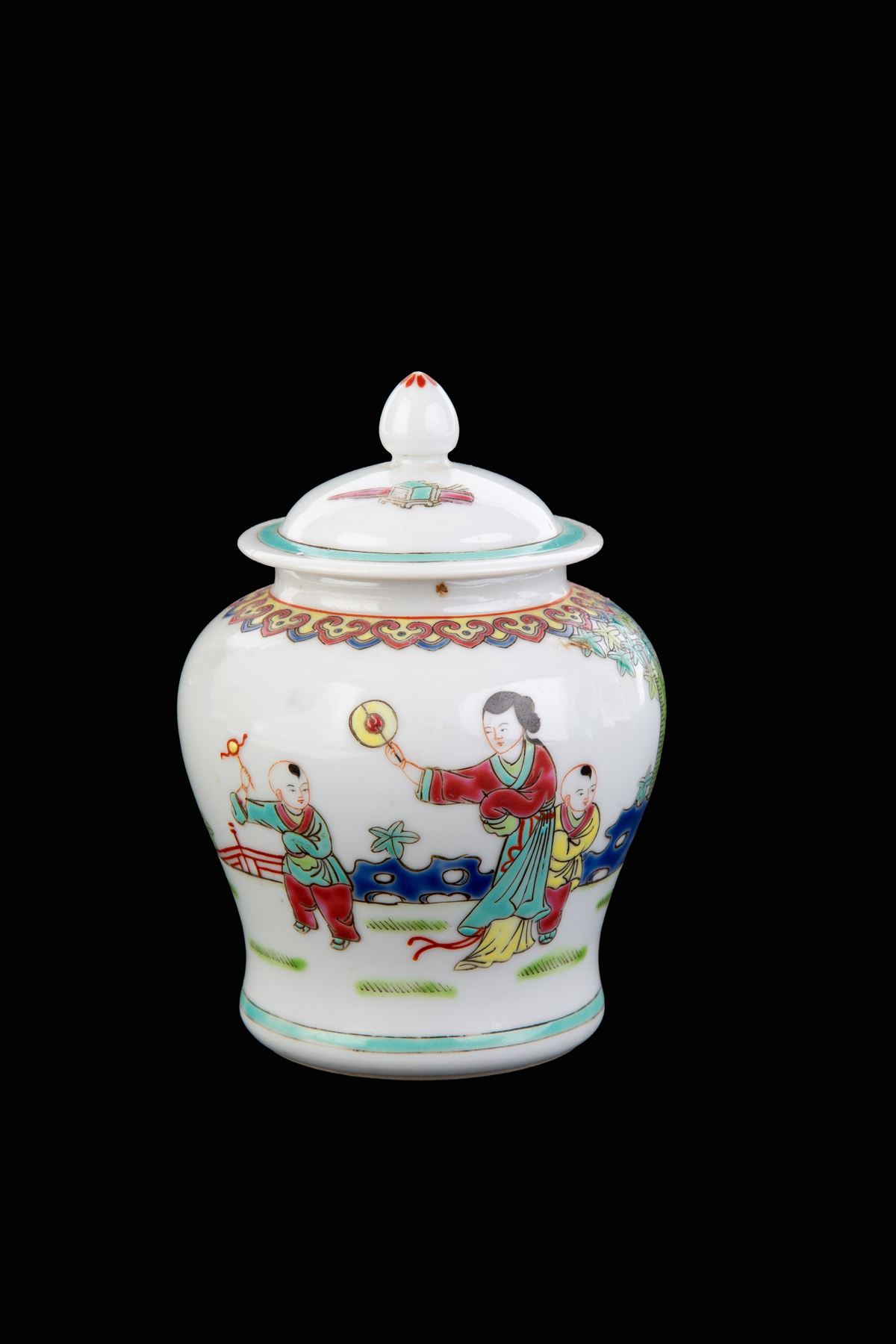 • Lot n° 0014 Vasetto con coperchio - Vasetto con coperchio in porcellana policroma con scene di vita orientali. Cina. Fine XIX-inizi XX secolo. - 14x10 cm ca. -