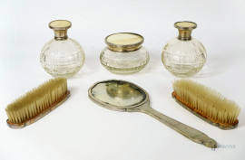 • Lot n° 0334 Set da bagno composto da tre contenitori in vetro, uno specchietto e due spazzole in argento, misura max cm 33,5x11,5 (difetti)